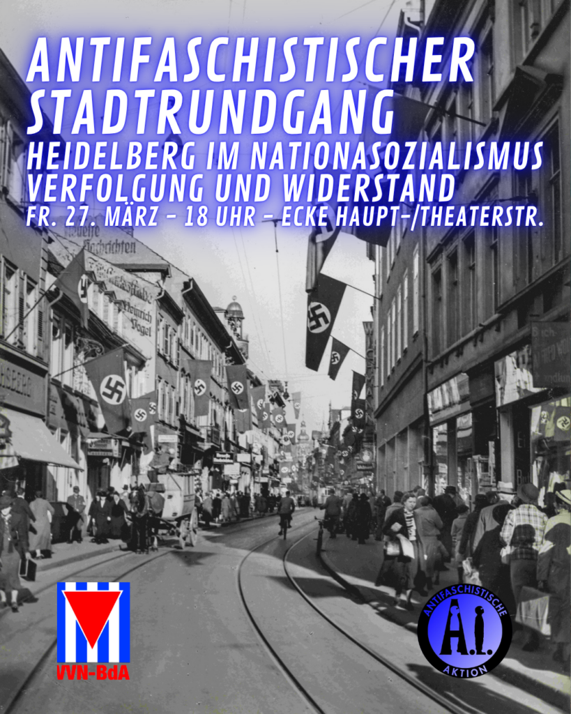 Am Mittwoch, 6. November 2024 organisieren wir – wie immer in Kooperation mit der VVN-BdA – den Antifaschistischen Stadtrundgang „Heidelberg im Nationalsozialismus – Verfolgung und Widerstand“. Treffpunkt ist um 16.00 Uhr an der Ecke Hauptstraße/Theaterstraße. Die Veranstaltung ist Teil des Kritischen Semesterstarts.