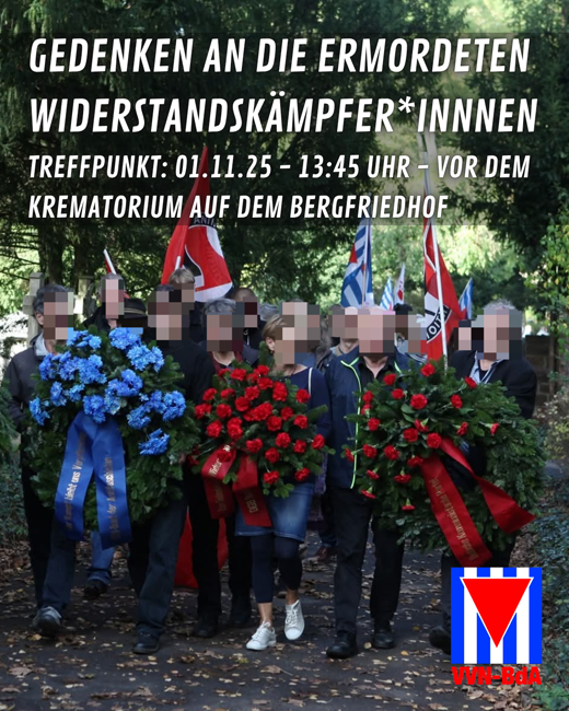 Am 1. November findet auf dem Heidelberger Bergfriedhof wieder die alljährliche Gedenkveranstaltung an die von den Nazis ermordeten WiderstandskämpferInnen statt. Auf Einladung der VVN-BdA Heidelberg und des DGB Heidelberg Rhein-Neckar wollen wir dort mit Redebeiträgen und musikalischer Umrahmung an diese mutigen Antifaschist*innen erinnern und an alle anderen Menschen, die von den Nazis verfolgt wurden, weil sie nicht in deren Weltbild passten. Auch wir werden uns mit einem Grußwort beteiligen. Treffpunkt ist um 13.45 Uhr vor dem Krematorium auf dem Bergfriedhof.